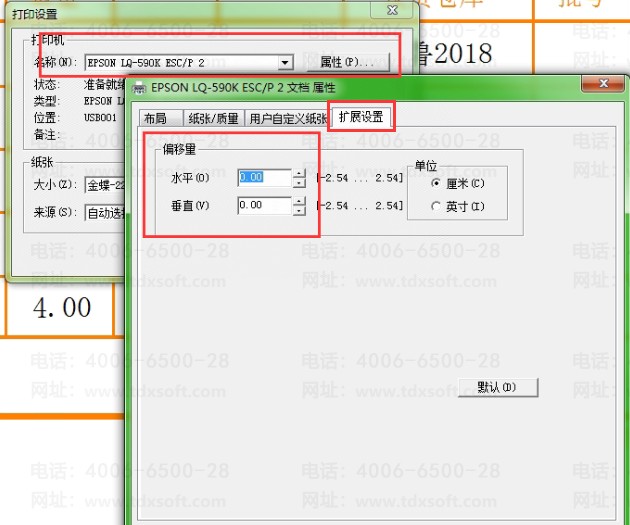 2、打开旗舰版中对应单据,点击打印预览,点击打印设置--属性--扩展设置,将偏移量调整成0,点击确定,打印正常。