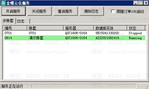 启用第三方仓储的方法:在服务器上登录订单100,右键订单100图标,选择“金蝶云仓服务”,此时会默认开启登录订单100的账套的云仓服务,对应账套的“状态”显示Runing。如需使用多账套多仓储(使用多个账套,每个账套都有使用第三方仓储),在账套管理中启用多账套之后,在金蝶云仓服务中选中相应的账套,点击“开启服务”即可。也可设置云仓服务“跟随订单100启动”。