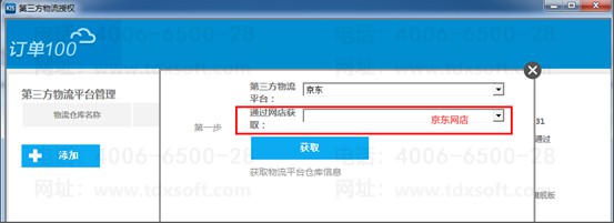 和京东先签协议后,京东会在他们的系统进行配置。配置完成后,在“通过网店获取”处选择与京东协议好的京东网店,点击获取就可添加仓库成功。