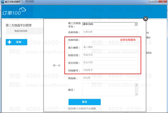 添加---顺丰OMS---填写仓库名称、仓库代码、接入编码、校验字段、货主代码、月结账号、供应商信息---保存。其中仓库代码、接入编码、校验字段、货主代码、月结账号均由仓库提供。