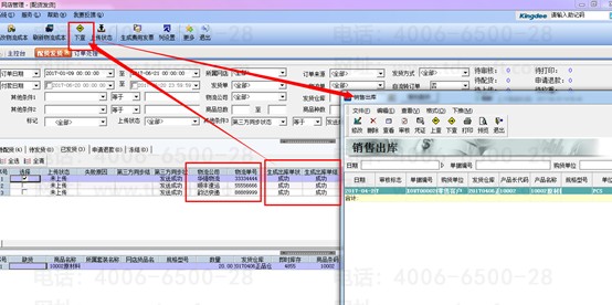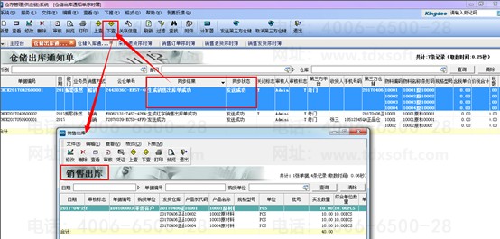 【生成出库单状态】和【生成出库单结果】均显示为成功,则通过【下查】按钮可以查看对应的销售出库单。发货完成之后,释放该商品的占用库存,同时即时库存减少相应数量。