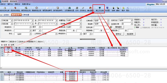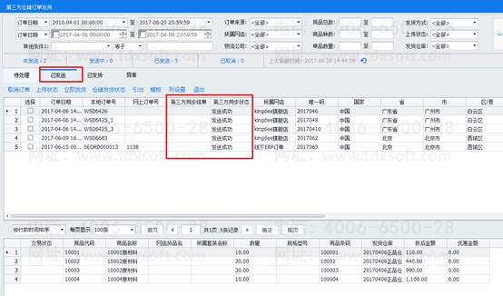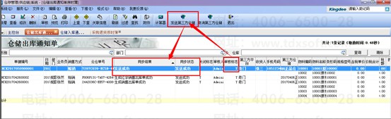 或者:在第三方仓储订单发货-待处理中,选择订单点击发送订单。发送成功订单自动到“已发送”中,第三那方同步状态显示“发送成功”。