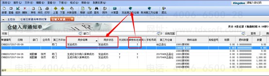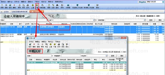 2.在仓储入库通知单维护中,选择需要发送的仓储入库通知单点击发送第三方仓储。发送成功后,同步状态显示“发送成功”,同步结果显示“发送成功”。如果仓库成功进行入库,则自动生成对应的入库单,同步结果显示“生成外购入库单成功”,生成的外购入库单可通过下查得到。