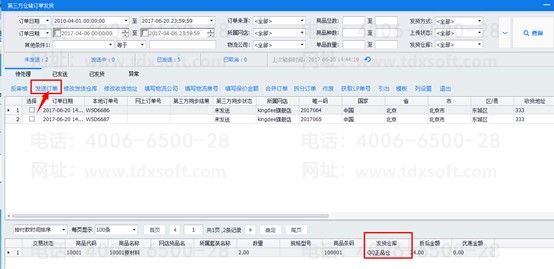 1.在配货发货-配货/发货-待配货中过滤订单,选择订单的发货仓库为第三方仓储的仓库,点击第三方仓储-发送订单。发送成功后第三方同步状态会显示“同步成功”。