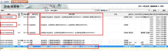 2.在异地调拨单序时簿中,选择需要发送的异地调拨单,点击发送第三方仓储 。发送成功后同步状态显示“发送成功”,同步结果显示“发送成功,出库指令成功”或者“发送成功,入库指令成功”。如果对单据进行相应的出入库,系统自动生成其他出库单、其他入库单,根据异地调拨单下查可查看。