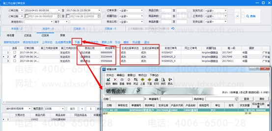 2.当第三方仓库成功接收该网上订单,仓库完成发货,并回传物流公司,物流单号,重量等信息,该网上订单从配货发货—待配货页签直接跳转至配货发货—已发货界面(第三方仓储订单发货界面,订单从已发送直接跳转至已发货界面)。同时自动上传物流信息至各电商平台。