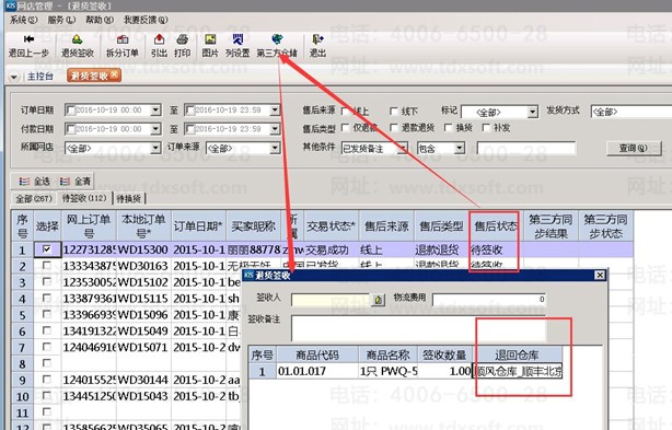 1.在电商管理-售后服务-售后处理-退货签收中,找到待签收状态的订单。点击”第三方仓储”会弹出退货签收的界面,选择退回仓库为第三方仓库即可。发送成功会在“第三方同步结果”中返回成功。