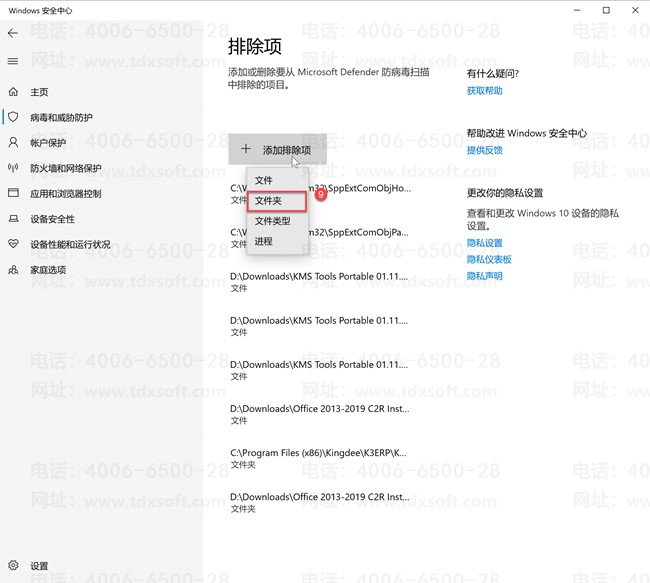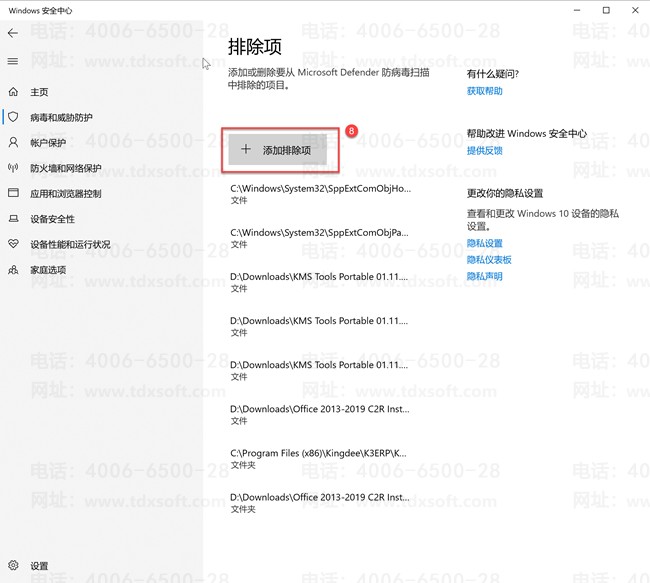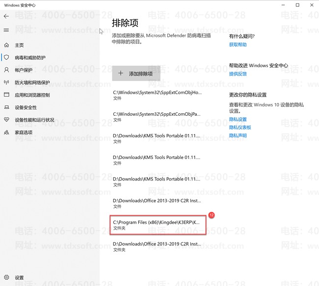 12、 到此,金蝶所在的目录已经添加在排除项中, Microsoft Defender不会再杀金蝶了。