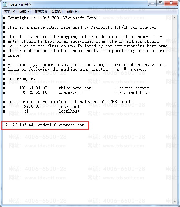 3.在hosts文件的最后面,添加IP地址和IP地址指向的域名,中间用空格隔开,如将域名order100.kingdee.com指向特定的订单100服务器IP(120.26.193.44),如下图所示,设置好之后保存即可。