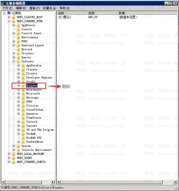3.删除Kingdee 文件夹卸载后32位操作系统删除C:\Program Files目录下的kingdee文件夹和C:\Program Files\Common Files 目录下的Kingdee文件夹;64位操作系统加删除C:\Program Files (x86)目录下的kingdee文件夹和C:\Program Files (x86)\Common Files目录下的Kingdee文件夹;如果安装在其他盘,找到对应盘安装路径删除对应的Kingdee文件夹。4.删除Kingdee注册表【Windows + R键】输入regedit进入注册表:如下图删除注册表编辑器中KEY_LOCAL_MACHING/SOFTWARE目录下的KINGDEE文件夹以及HKEY_CURRENT_USER/SOFTWARE目录下的KINGDEE文件夹(没有可不删除)