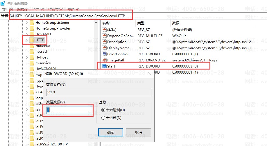8、如果在服务器上登录出现此提示,并检测到服务器10007端口不通,可检查HTTP是否被禁用,检查注册表中\HKEY_LOCAL_MACHINE\SYSTEM\CurrentControlSet\Services\HTTP中Start的值是否是3,如果不是,改成3,之后重启服务器即可。