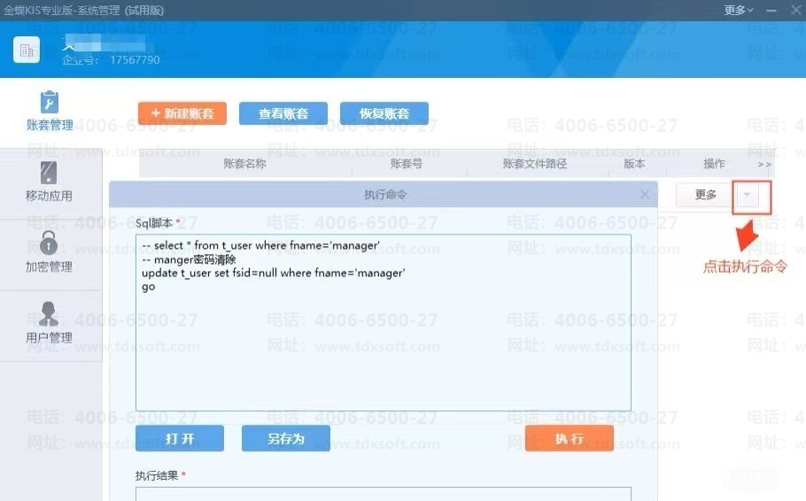 3.服务器电脑 打开系统管理账套后面得点击【更多】--【执行命令】