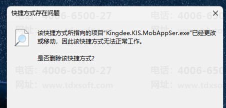 近期在登入“系统管理”时;频繁出现系统提示:该快捷方式所指向的项目"Kingdee.KIS.MobAppSer.exe"已经更改或移动,因此该快捷方式无法正常工作