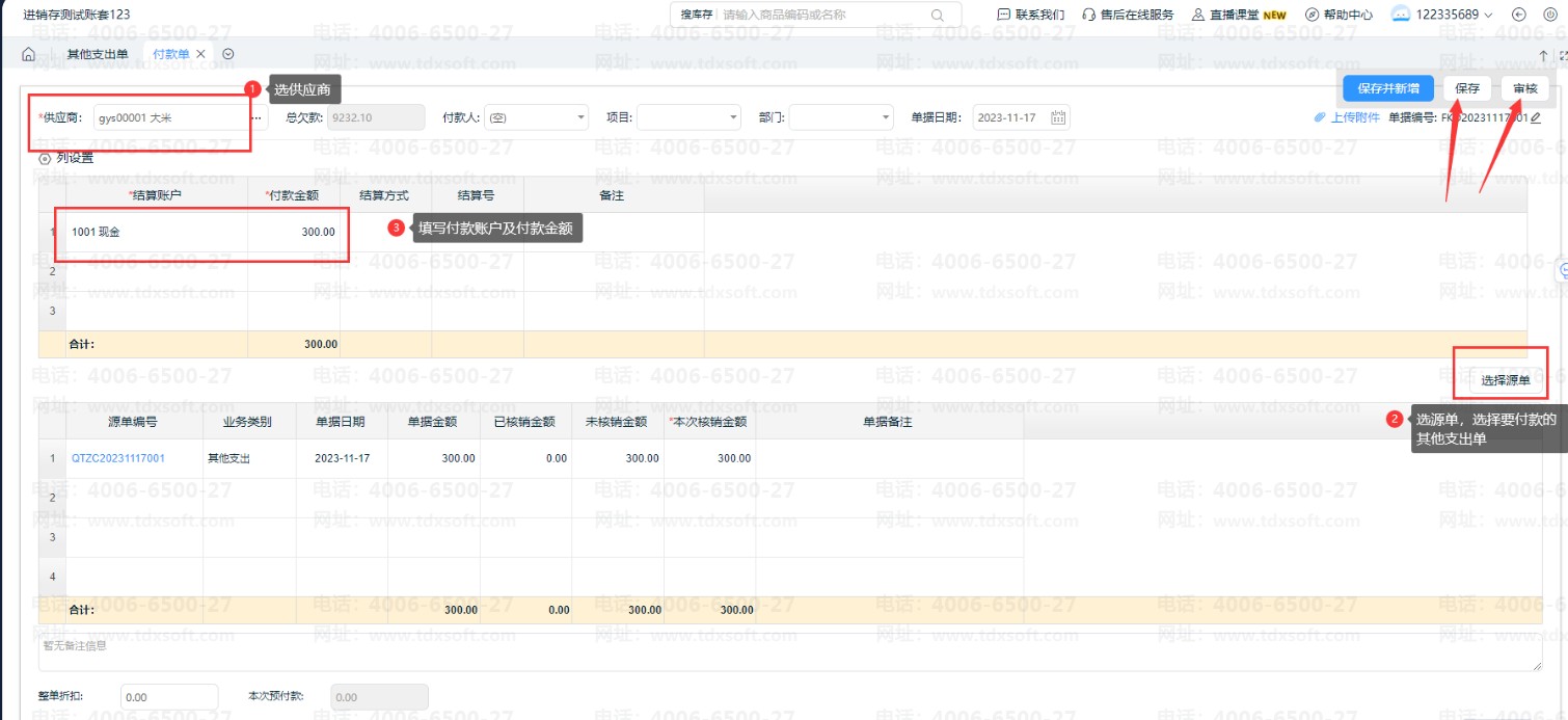 后续付款时做付款单选源单核销,录好付款信息选好源单后保存审核单据