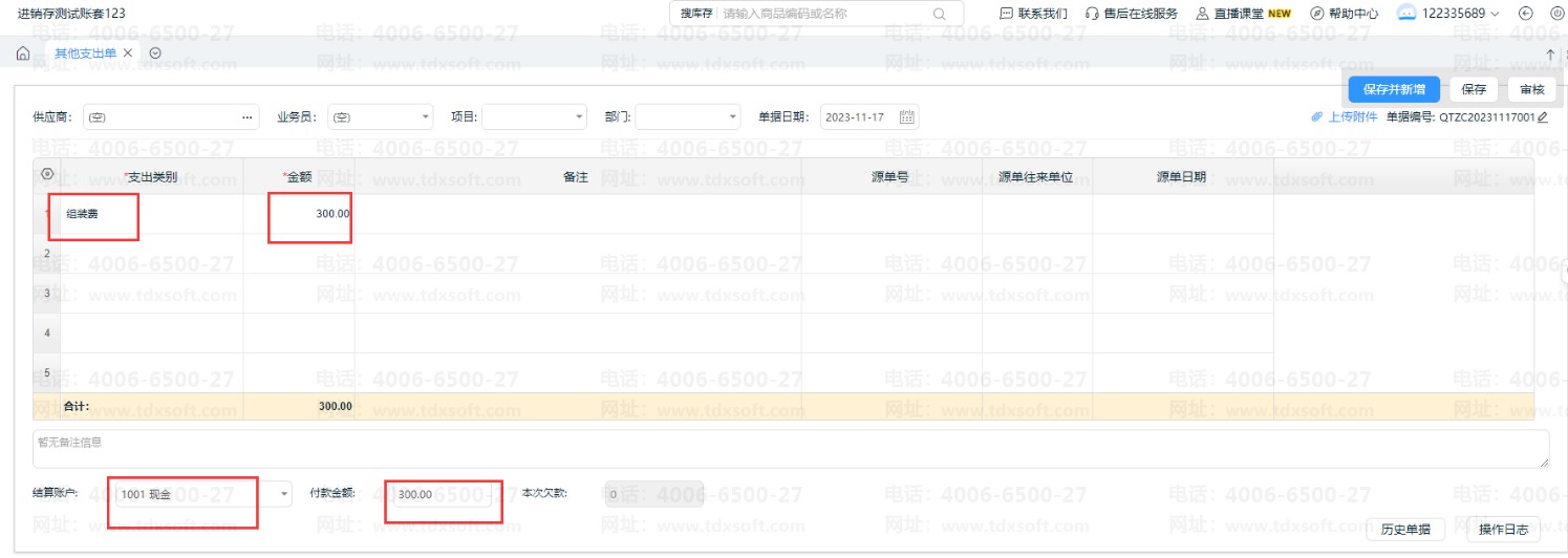组装单里的组装费在录入后无法直接生成支付单据,需要单独做其他支出单进行支付