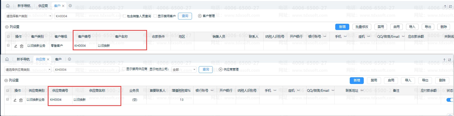 如图,同时新增了客户和供应商:以旧换新