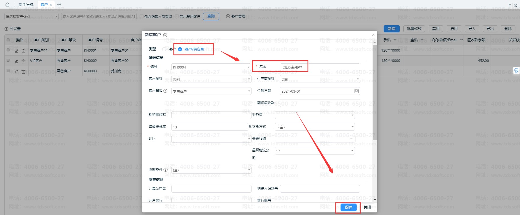 1、首先新增客户,勾选【客户/供应商】一起新增,即涉及以旧换新业务同是客户和供应商,后续处理往来核销。