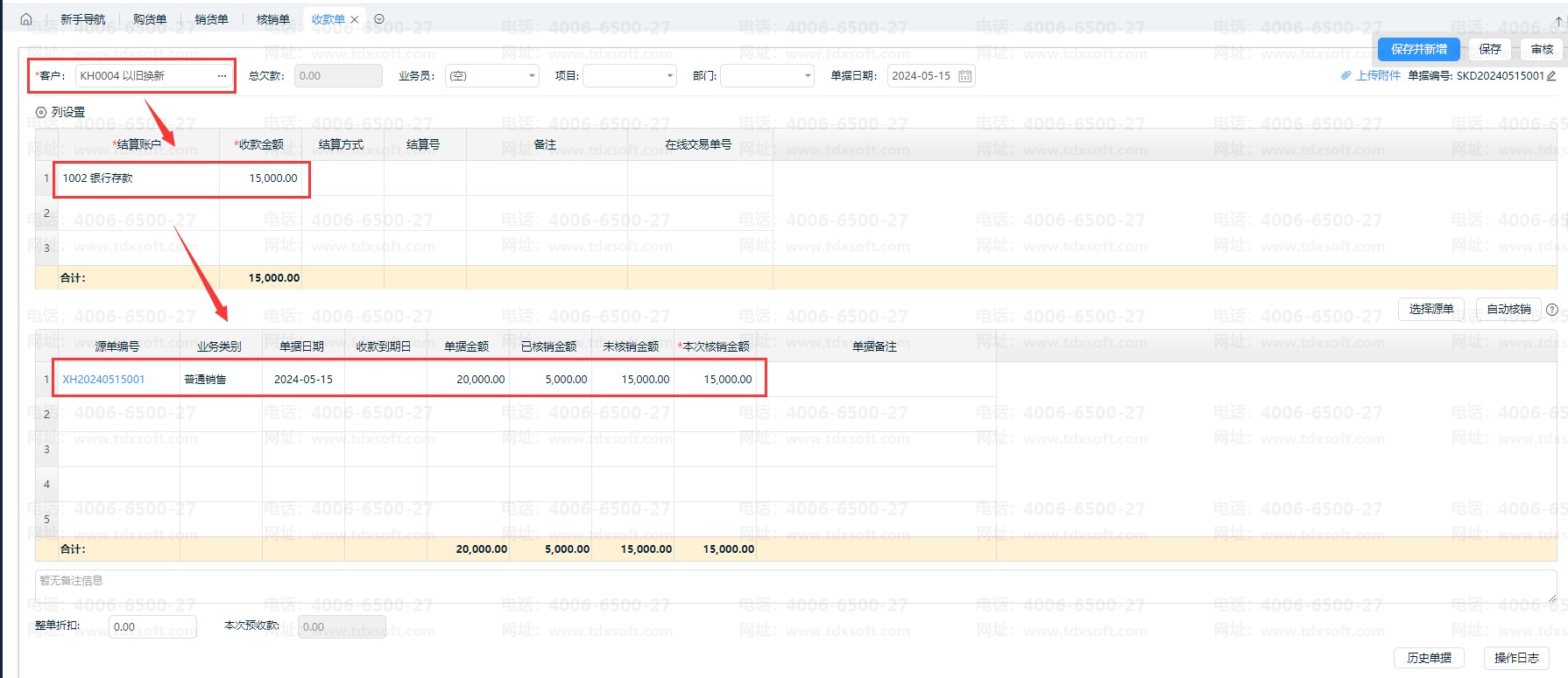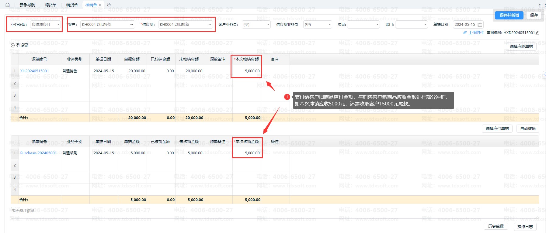 如图,业务类型【应收冲应付】,客户/供应商选择【以旧换新】,支付给客户旧商品应付金额,与销售客户新商品应收金额进行部分冲销。如本次冲销应收5000元,还需收取客户15000元尾款。