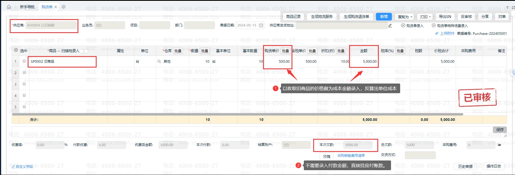 2、收到旧商品,以【购货单】记录旧商品入库,如以收取旧商品的金额做为入库成本,可直接在【金额】栏录入。