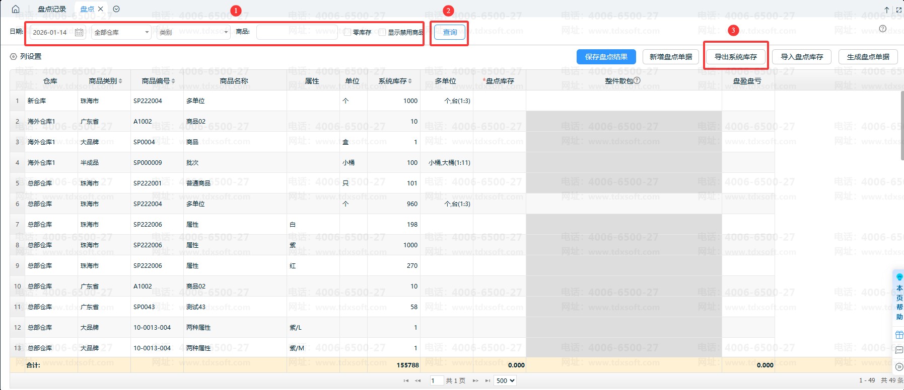 打开【仓库】-【盘点】,按实际业务情况筛选查询盘点表,然后再点击右上角【导出系统库存】导出系统库存。