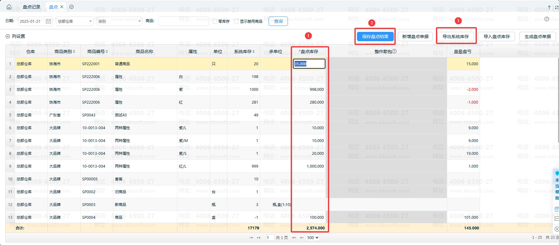 ①打开【仓库】-【盘点】,已在“盘点库存”中录入盘点数量,并【保存盘点结果】生成盘点记录,可点击右上角【导出系统库存】导出。