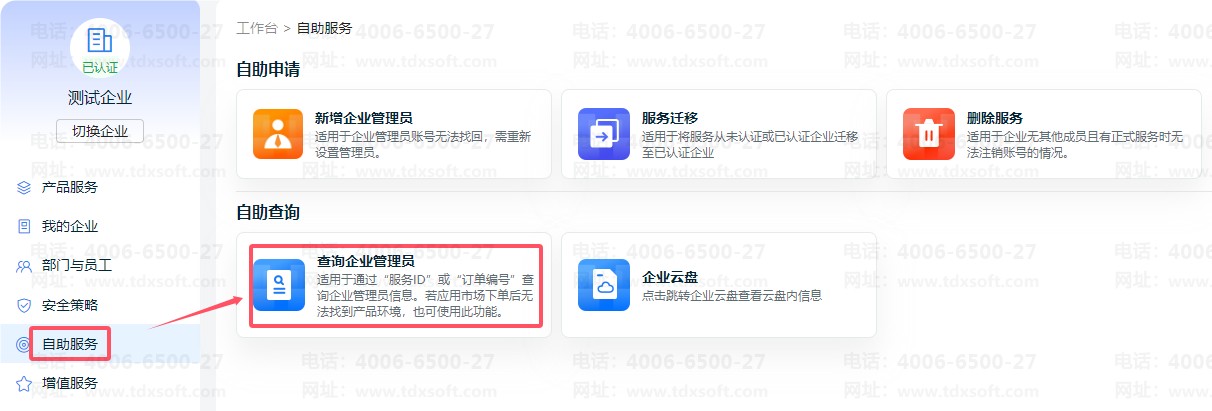 系统也支持在【自助服务】界面,适用于通过“服务ID”或“订单编号”查询企业管理员信息。