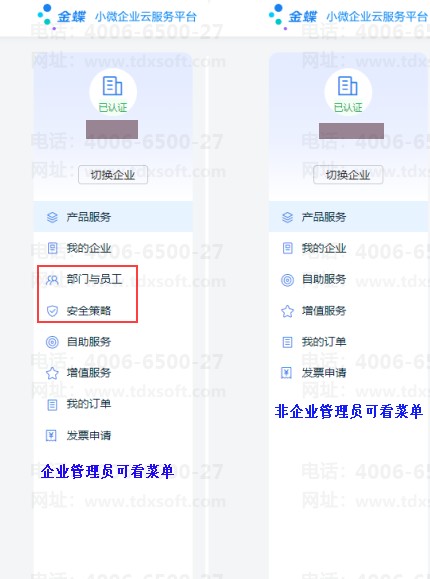 4、企业管理员可以看到【部门与员工】和【安全策略】菜单,非企业管理员看不到。