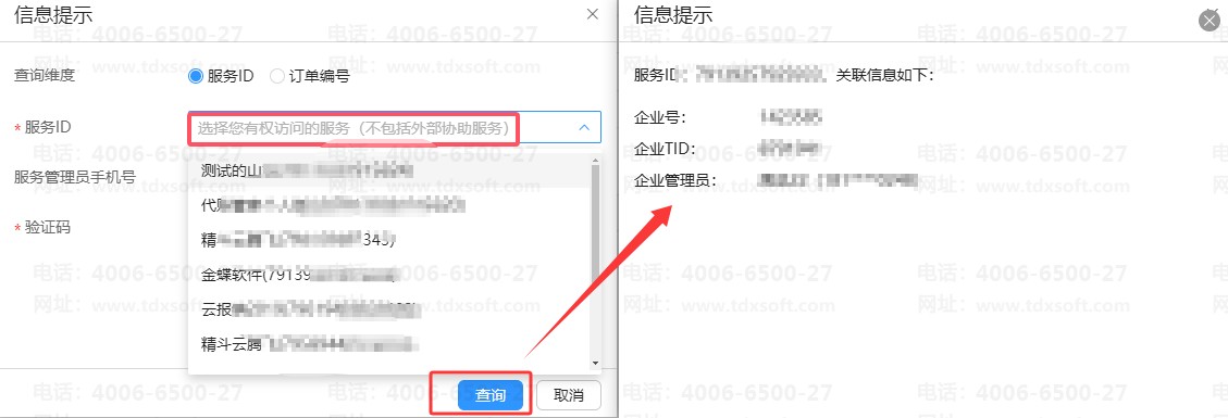 查询维度可以按服务ID和订单单号,下拉可以选择对应的服务ID,获取服务管理员手机号验证查询。如图:仅能看到企业管理员姓名及企业号等。