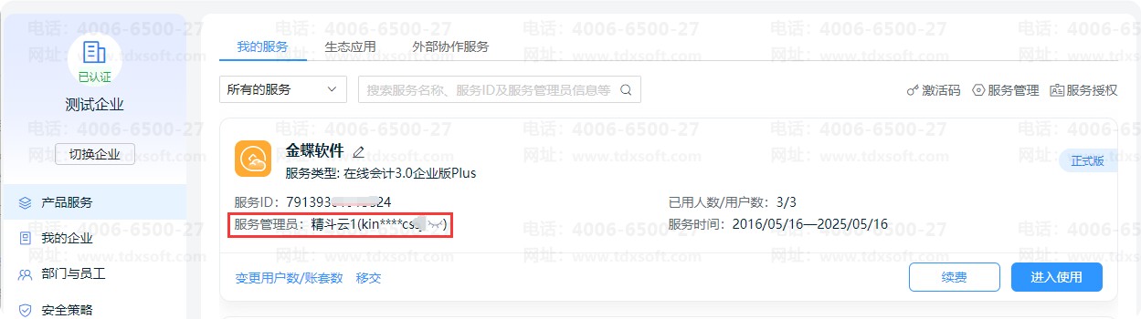 企业管理员与服务管理员(账套管理员)都可在小微企业云服务平台(工作台)查看。