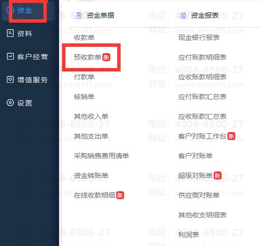 1.1、在【资金】模块下新增【预收款单】