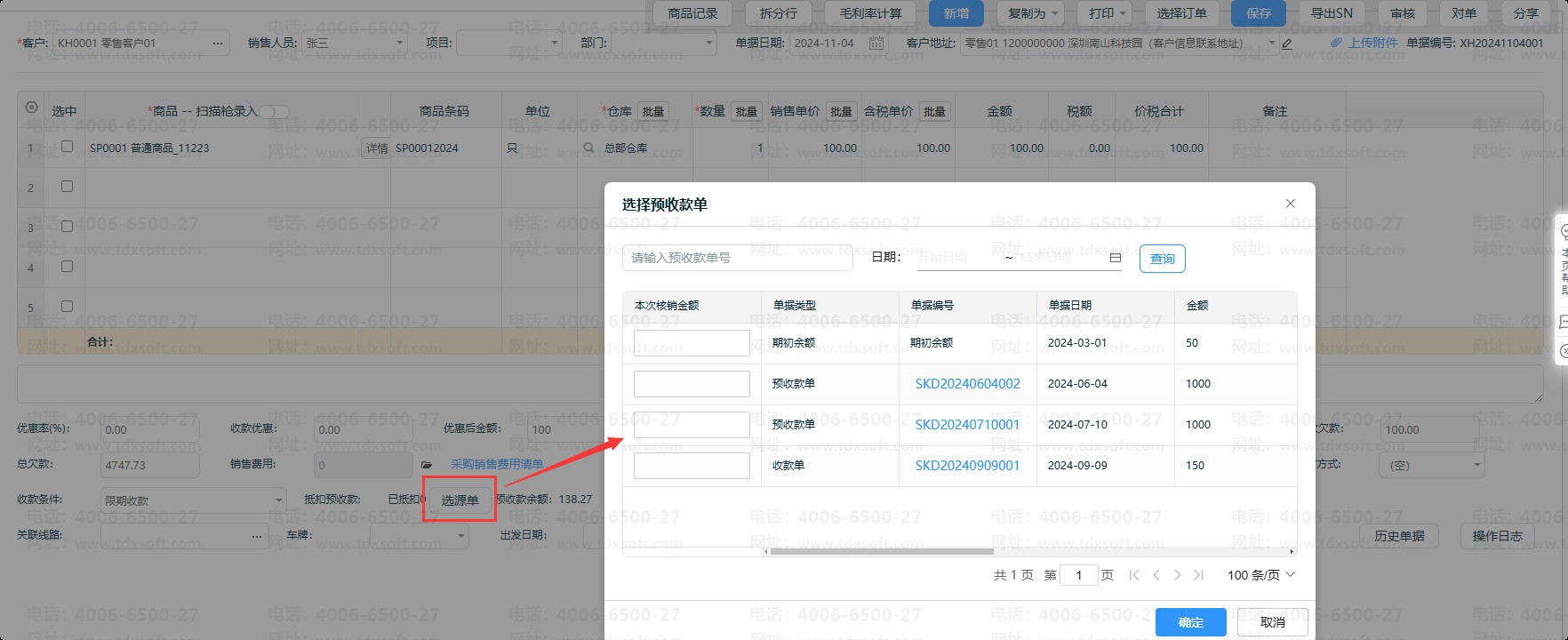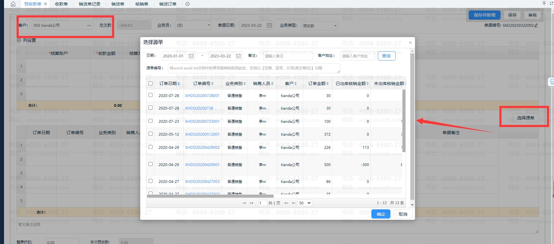 2.1、在预收款单编辑界面,点击【选择源单】,支持选择一笔或多笔销货订单,关联销货订单。