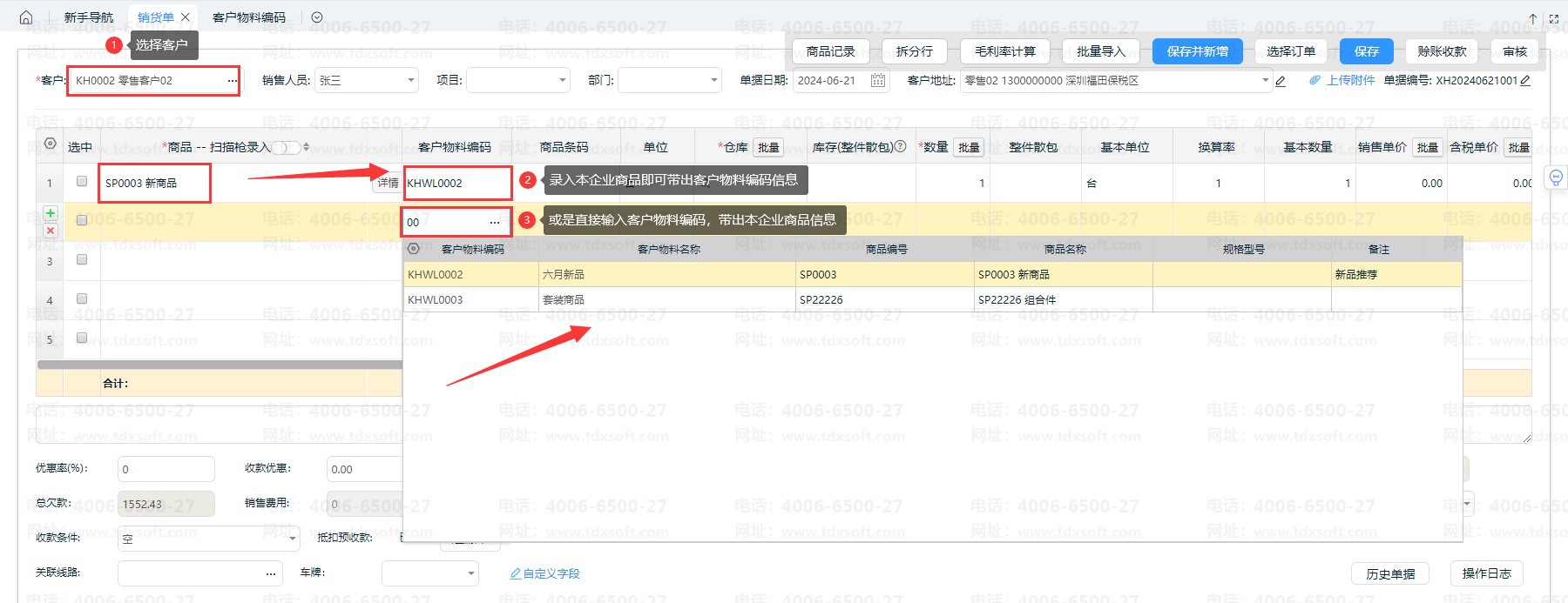 4、录入单据时,选择该客户及本企业商品信息,则会带出客户物料编码;或是通过输入客户物料编码,带出本企业商品信息。
