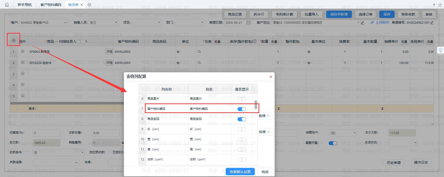 3、在单据编辑界面,在【列设置】-显示【客户物料编码】字段