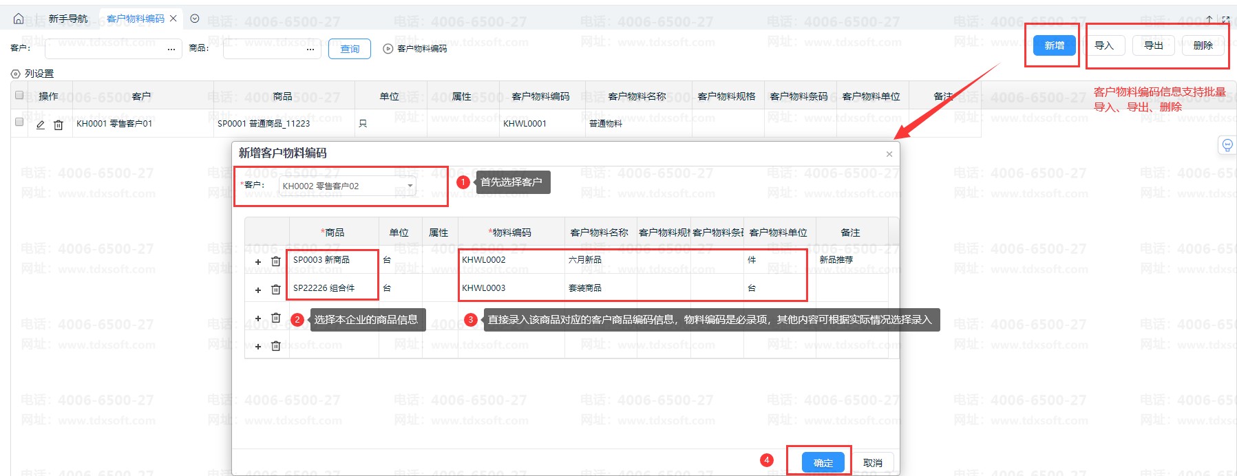 2、点击右上角【新增】选择客户信息,然后选择本企业的商品,再录入对应的客户企业商品信息。另外,客户物料编码支持批量导入/导出/删除。