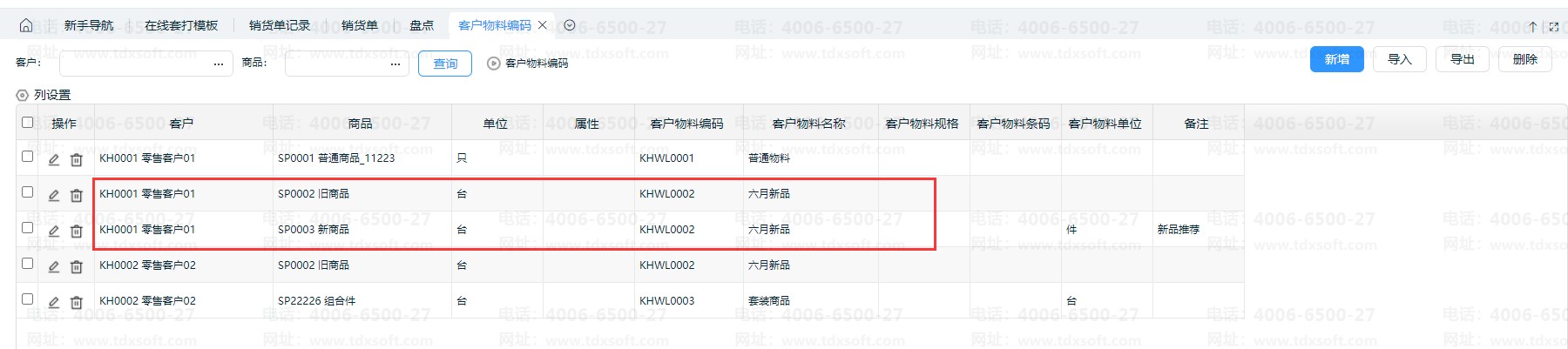 6、同一客户,不同的商品可以设置相同的客户物料编码