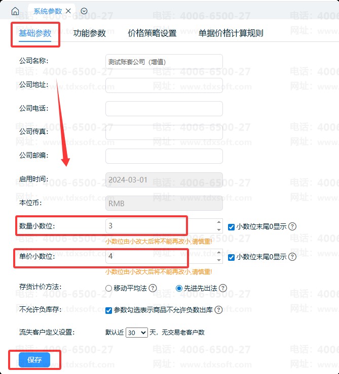 在基础参数中,可输入“数量小数位”和“单价小数位”,设置完成后,保存参数即可完成设置。如图:
