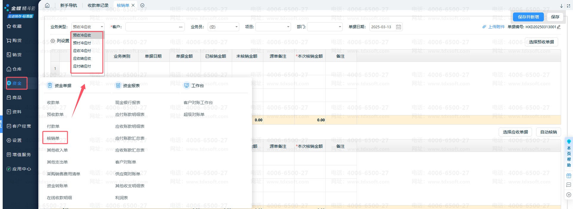 3、目前云进销存支持的核销业务类型有五种: