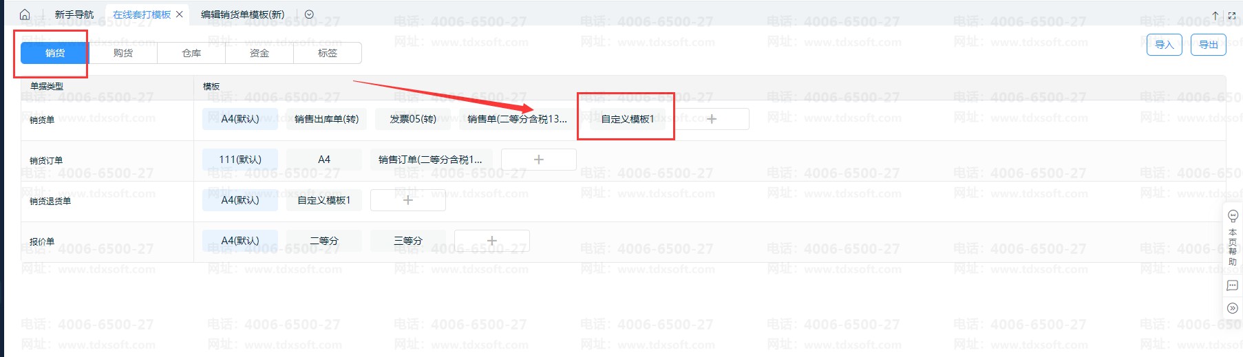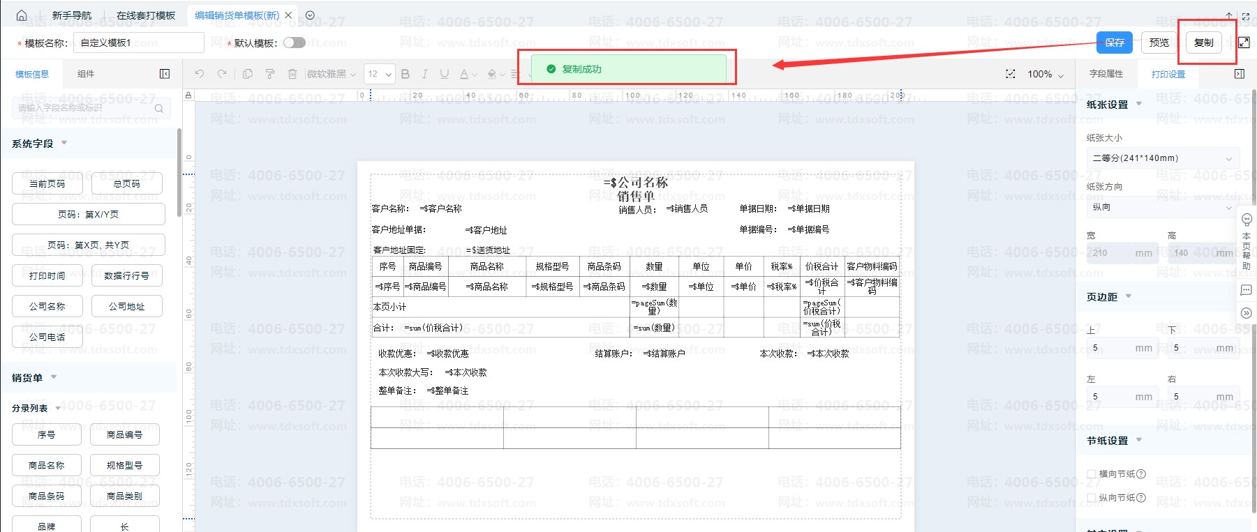 在线套打模板只能复制为相同单据类型的模板,不能复制为其他单据类型的模板。如销货单的模板只能复制为销货单的另外一个模板,不能将销货单的打印模板复制为购货单的打印模板