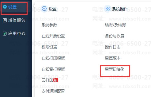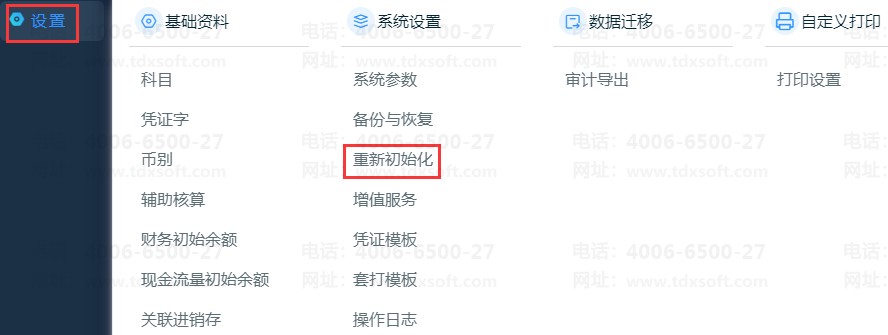 服务管理员(账套管理员)登录进入账套,点击【设置】-【重新初始化】(仅管理员账号有权限操作)