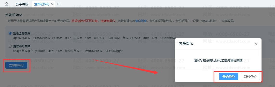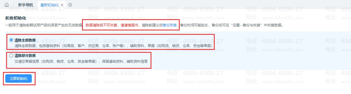 2、云进销存支持两种重新初始化方式: