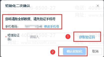 3、完成上一步后,弹出【重新初始化】对话框,完成短信验证,即可重新初始化成功。(验证手机号为管理员绑定的手机号)