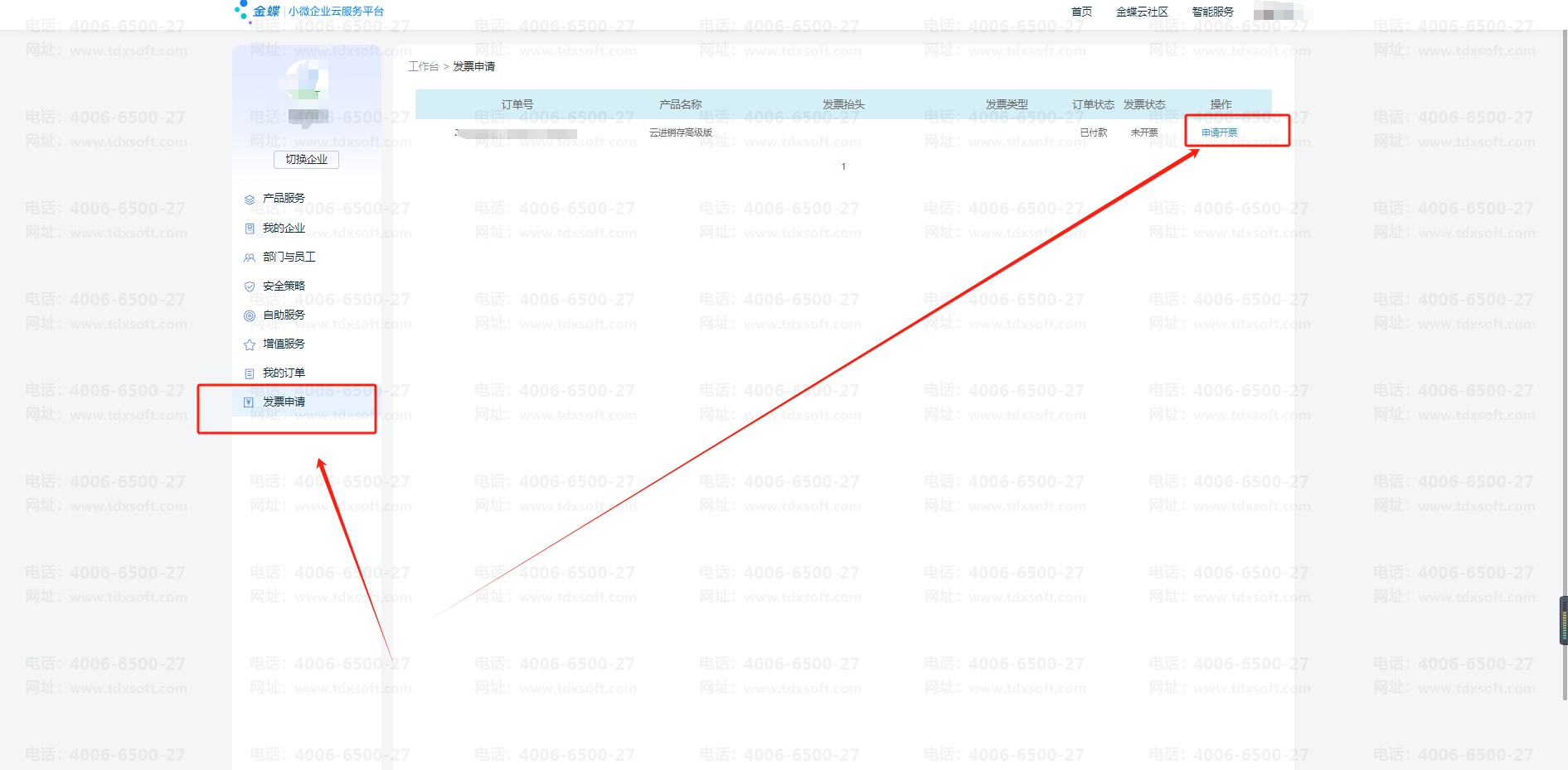 2、进入工作台,在左侧菜单栏【发票申请】,找到对应订单,点击【申请开票】即可申请开票;