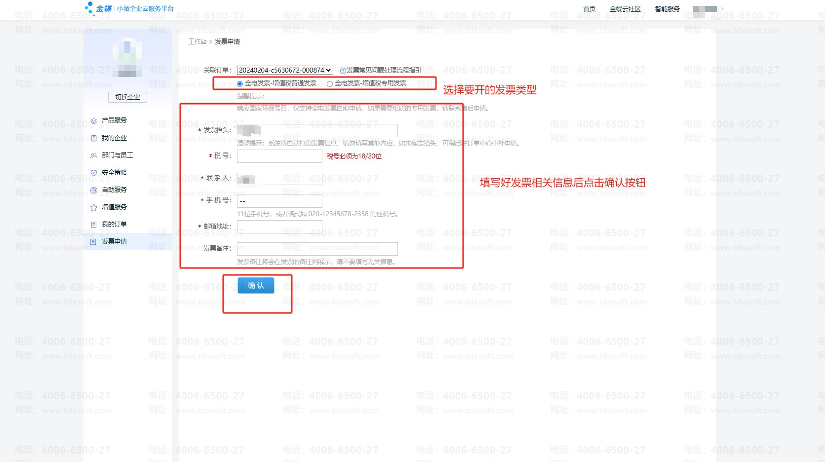 3、选择发票类型,填写好发票相关信息后点击确定即可。