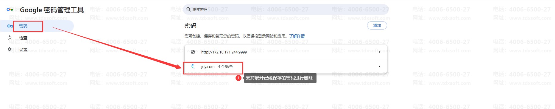 已经保存的密码可以在密码界面删除
