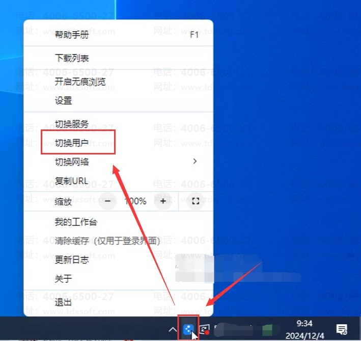 2、或是在电脑桌面右下角,右击客户端图标,点击【切换用户】回到登录界面,取消勾选【自动登录】。