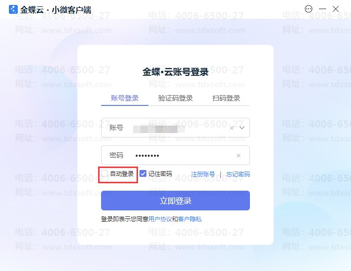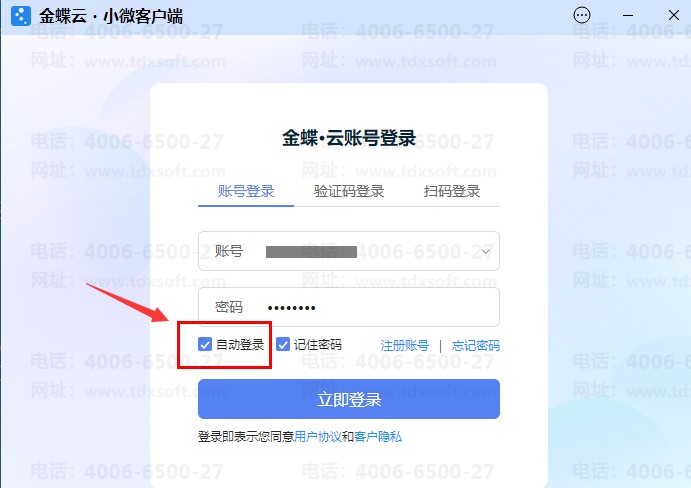 小微客户端使用账号密码登录时,勾选【自动登录】,则下次登录时会默认上次的用户身份自动登录进入工作台。