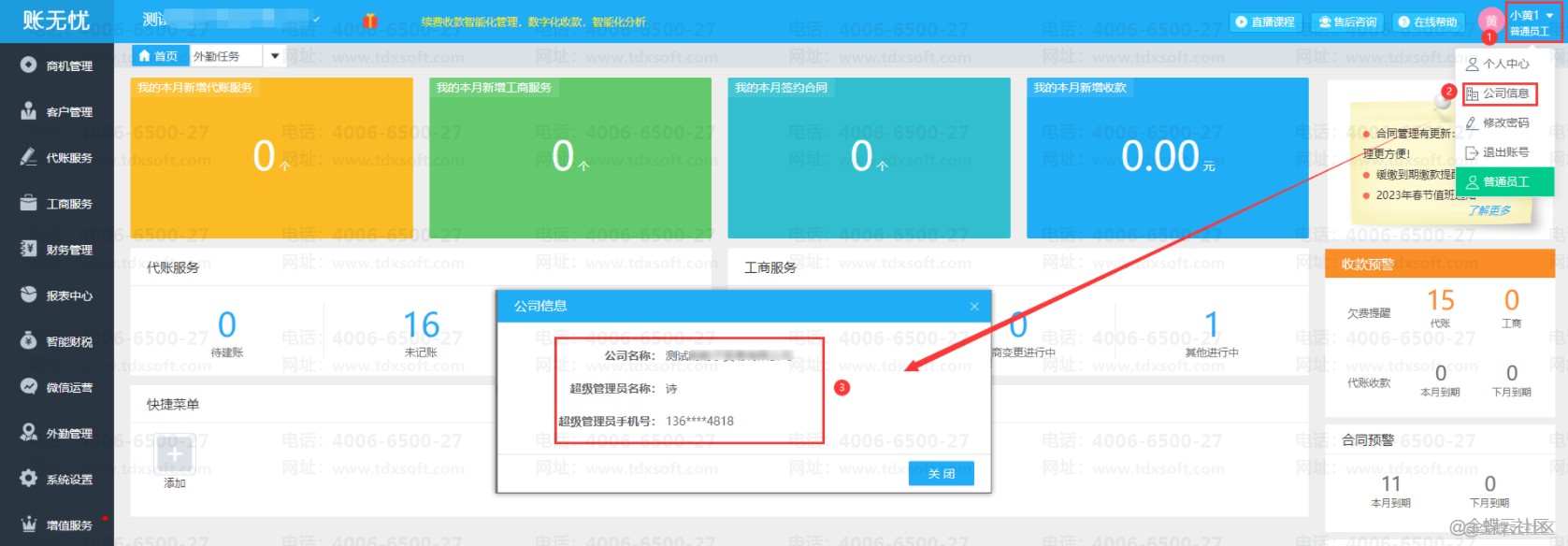 进入账无忧系统后,鼠标放到名称上,点击【公司信息】,即可查看到系统超级管理员信息。