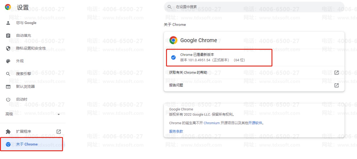 ——选择【设置】——选择左侧菜单栏最下方【关于Chrome】——等待页面自动检测&下载最新版本——下载完成后重启浏览器——升级完成