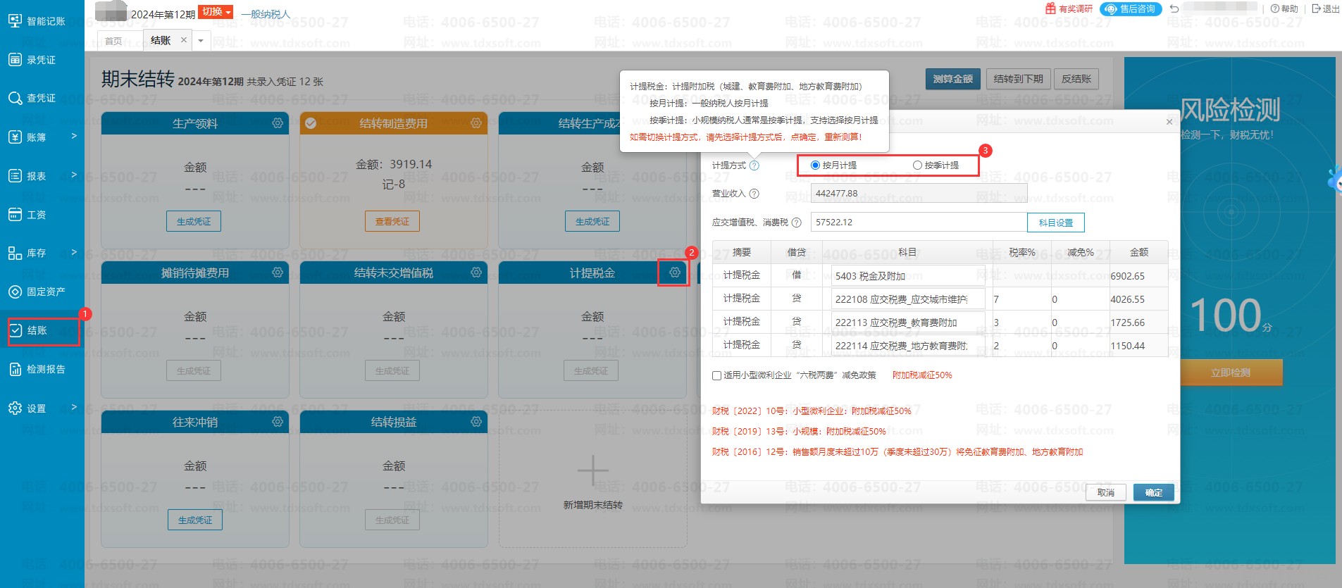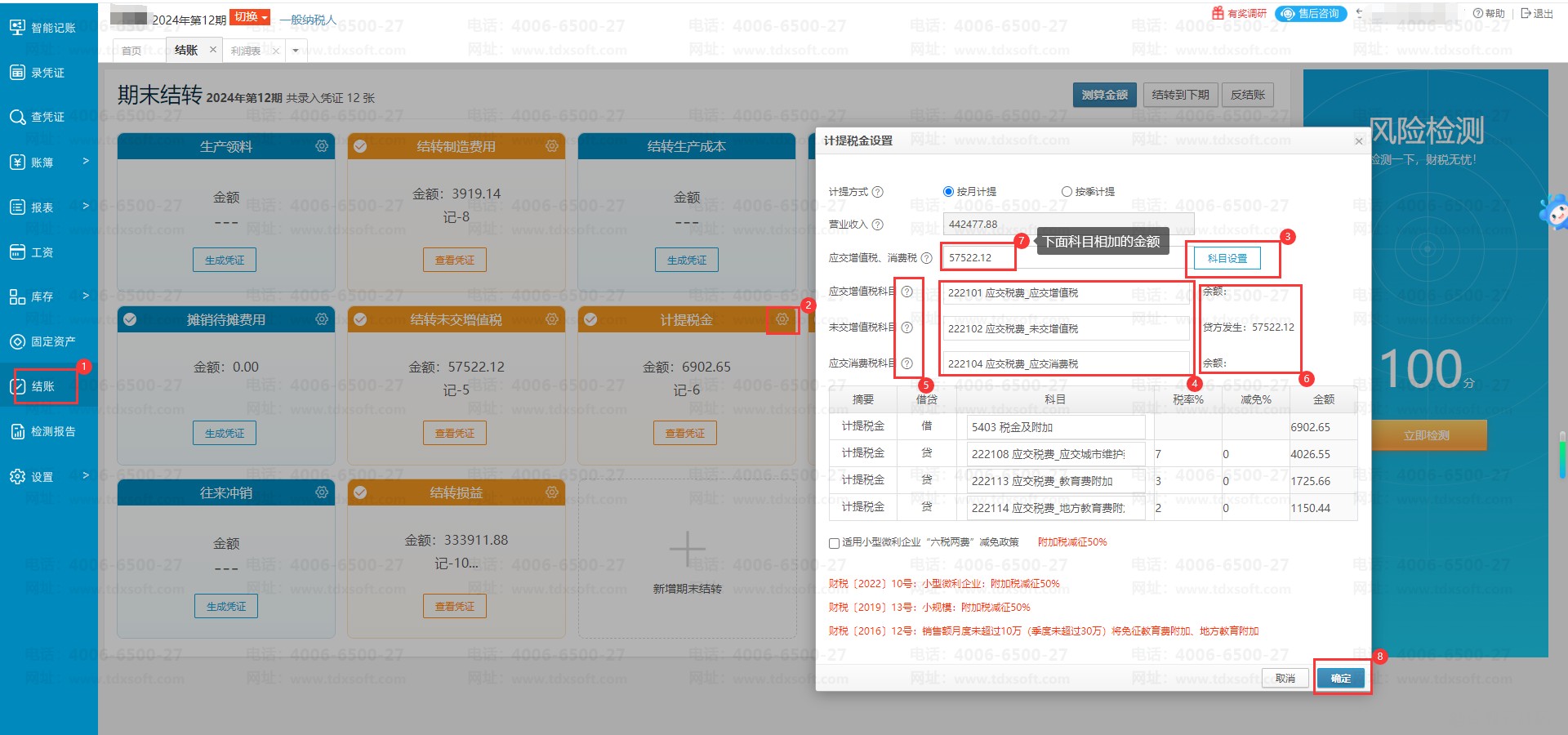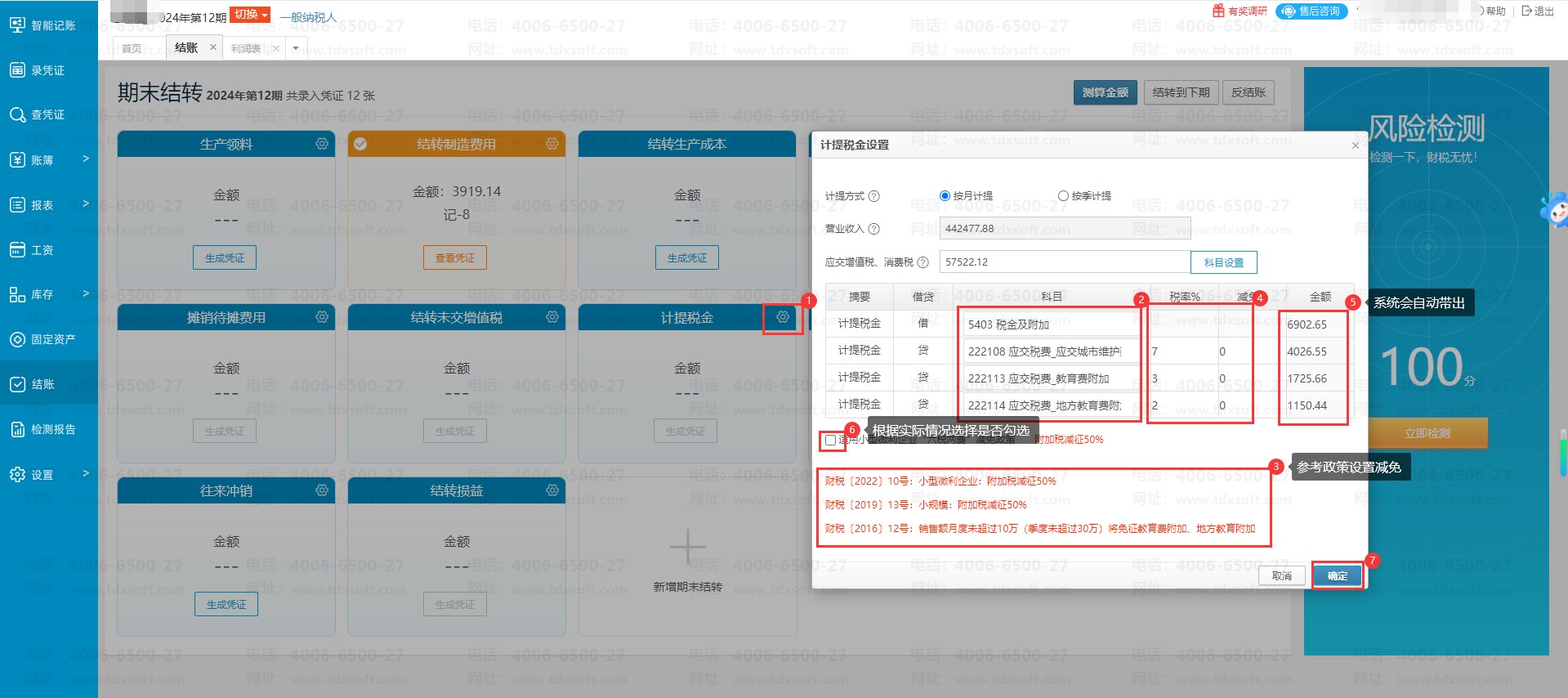 点击【结账】,进入结账界面,点击计提税金模块上方的齿轮,设置计提税金生成的凭证分录,计提税金的借方科目选择税金及附加一级科目,贷方科目选择对应的应交税费的下级科目,税率是固定的不可修改,根据营业收入金额,参考对应财税政策在减免%下设置减免率,设置后计提的金额系统会自动带出,设置好之后,点击【确定】保存即可。