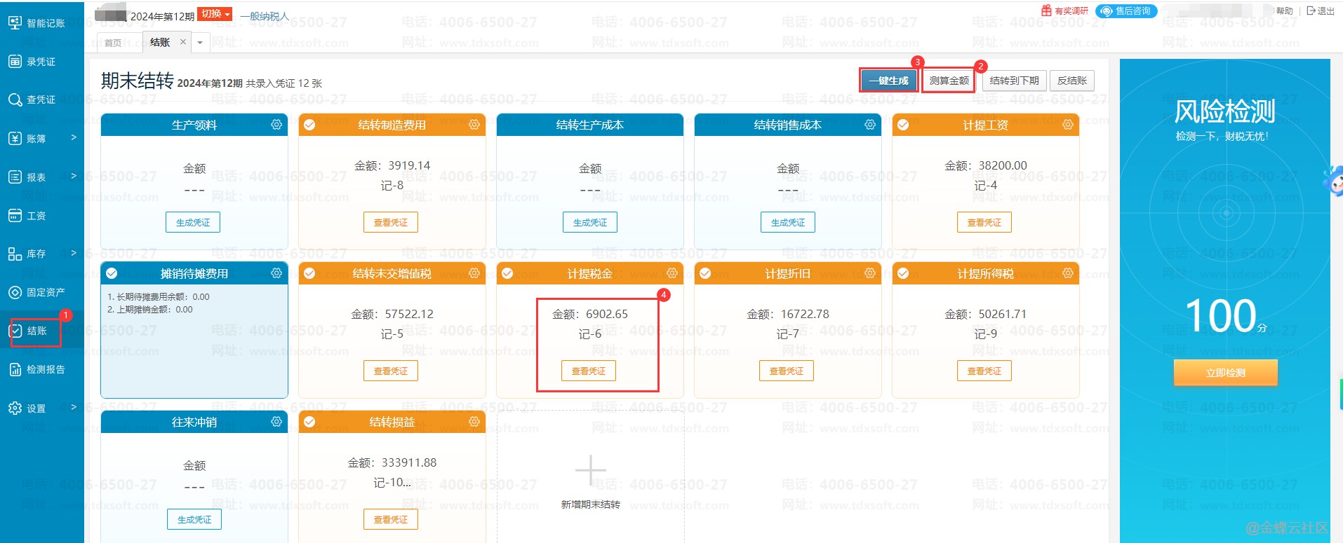 点击【结账】,进入结账界面,点击【测算金额】按钮,显示出具体的金额后再点击计提税金模块上显示的【生成凭证】按钮,即可生成计提税金的凭证,或者需要批量生成结账模块所有测算出金额的模板凭证,则点击【一键生成】按钮即可生成所有测算出金额的模板凭证,计提税金模块显示黄色就说明已经生成凭证,可点击【查看凭证】。